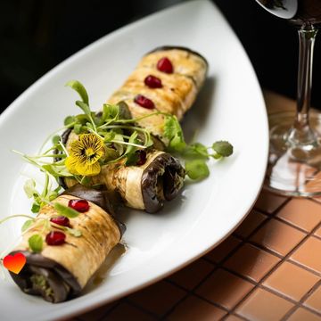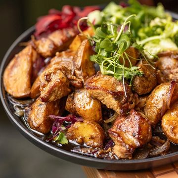 Traditional home style veal with roasted potatoes and onion, pomegranate sauce.