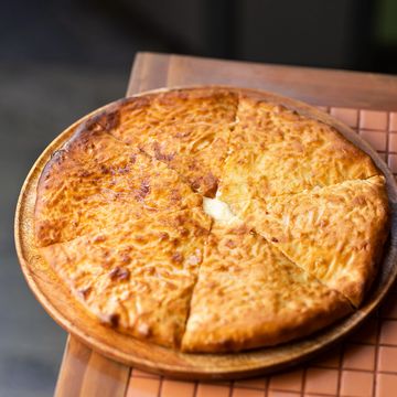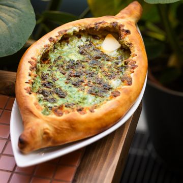 Traditional, boat - shaped cheese bread with green adjika and cheese and butter