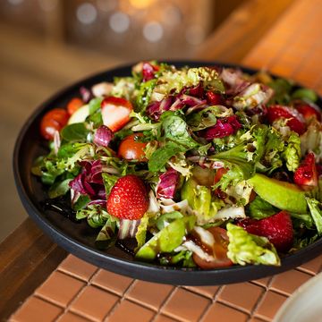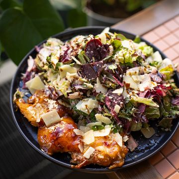 Salad with chicken, prepared in sweet chilli sauce, fresh beetroot and carrot